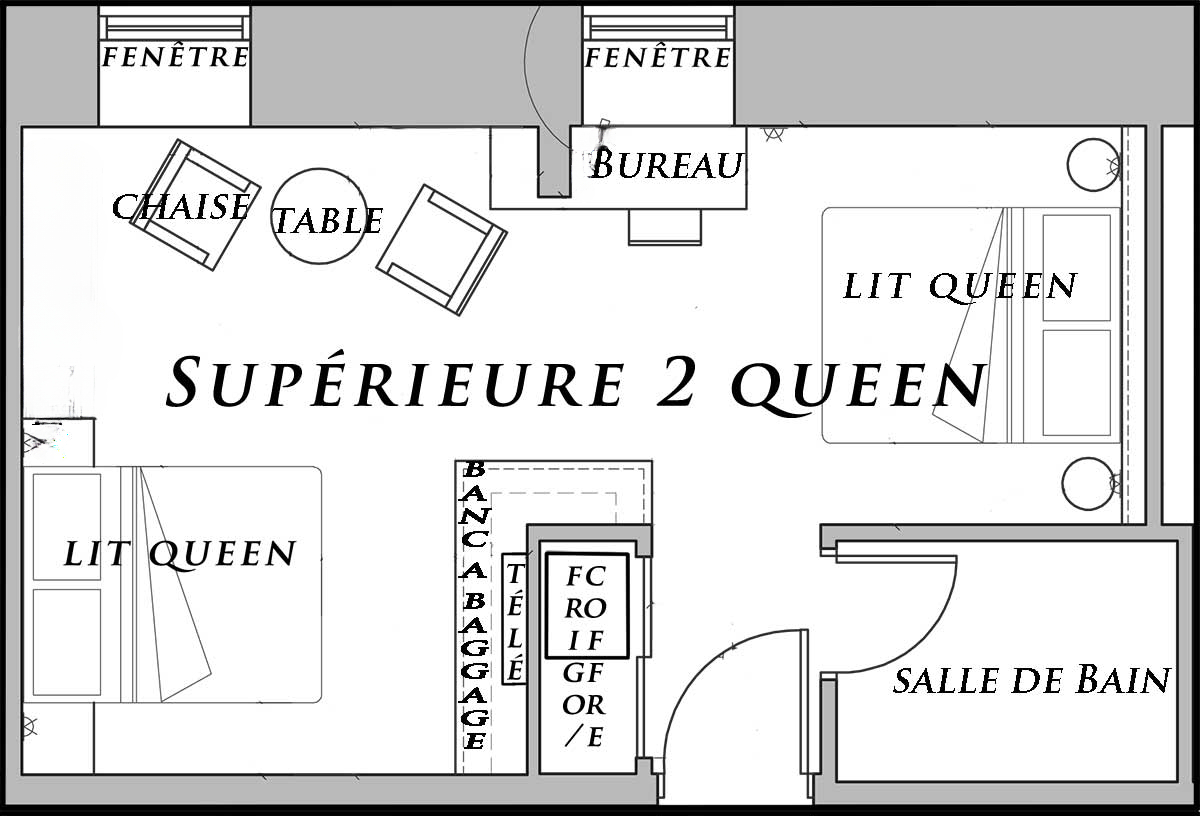 Superior 2 Queen category of rooms are more spacious than our standard rooms (20 square feet more). The beds are placed on opposites sides of the room, which offers a little more privacy. Also, there is a small seating area with two lounge chairs, a side table and space for luggage for your convenience.